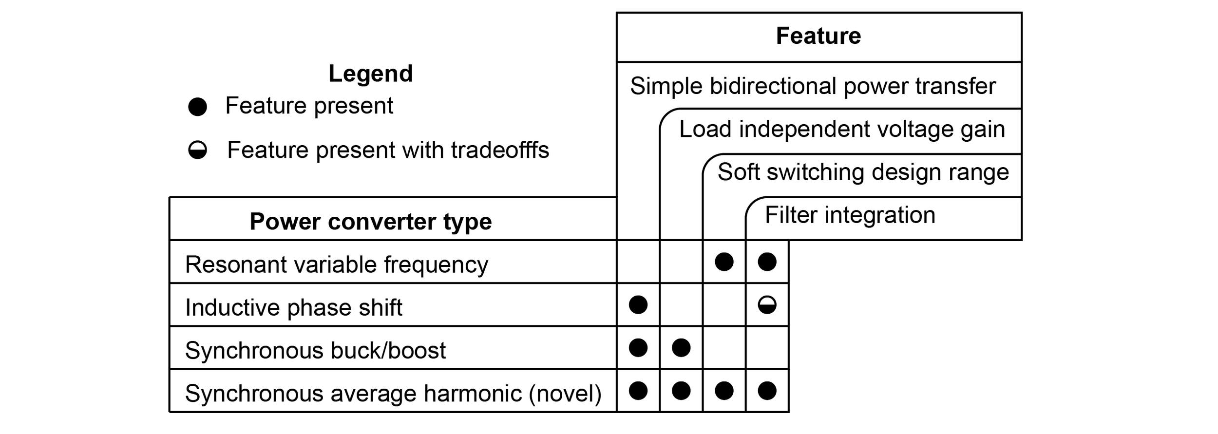 Our technology balances efficiency and implementation favorably relative to selected classic DC/DC power converter architectures. The following table illustrates nominal characteristics of modern power technologies such as: bidirectional power transfer, load voltage regulation, efficient operation, and filter material integration.