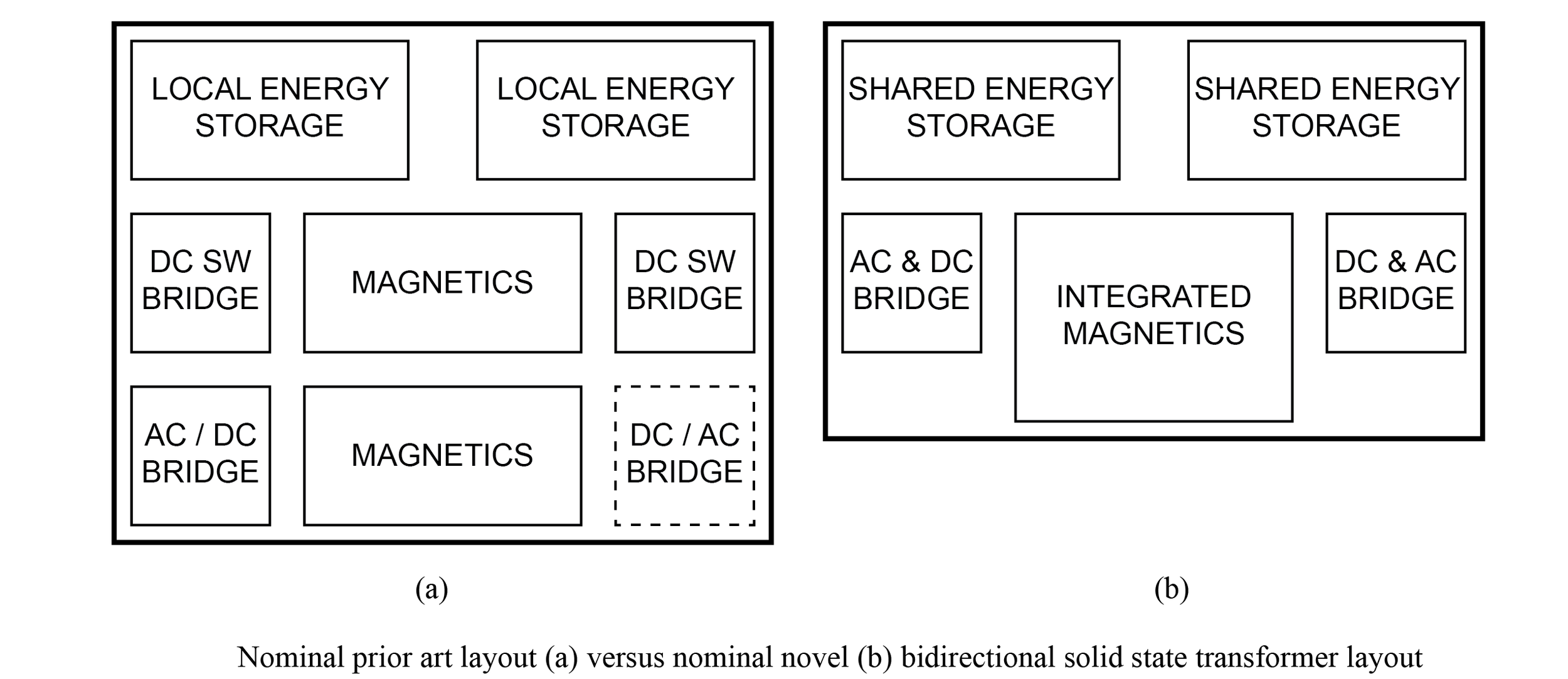 While an exact comparison to prior art will depend on the specific application, a potential relative comparison to a prior art solid state transformer with comparable functionality (and an AC/DC converter with dashed elements omitted) is illustrated in the following figure to show proportional material benefit associated with reduced active bridge and power magnetic components. Our technology applied to a single stage solid state transformer application results in elimination of two active bridges relative to the prior art example, with further related reductions associated with independent controllers, bridge drivers, and mechanical interfaces. Transformer and filter components may further be integrated using our technology to reduce weight and material cost.